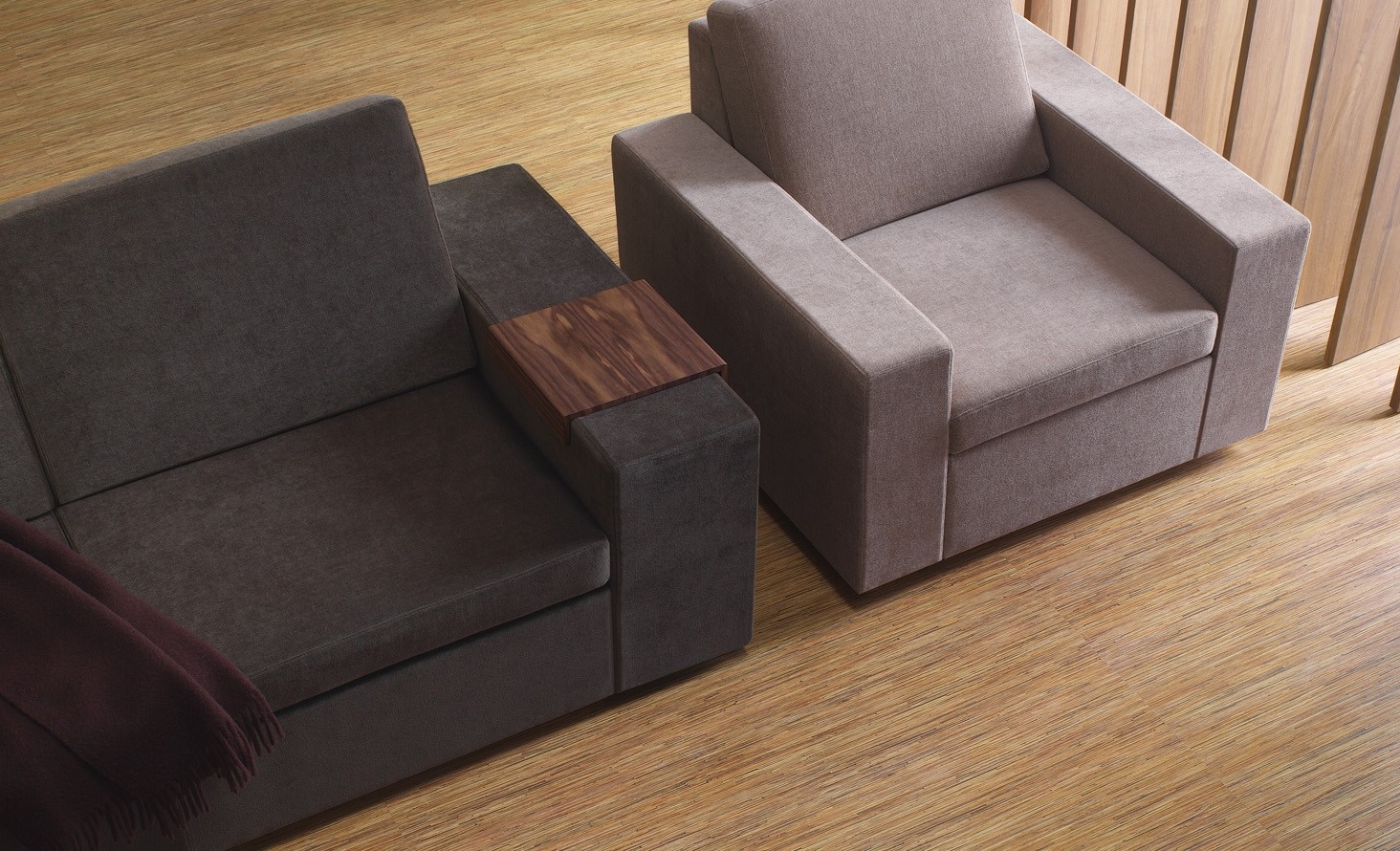 Klasyczna linia mebli wypoczynkowych o prostej kubicznej formie.