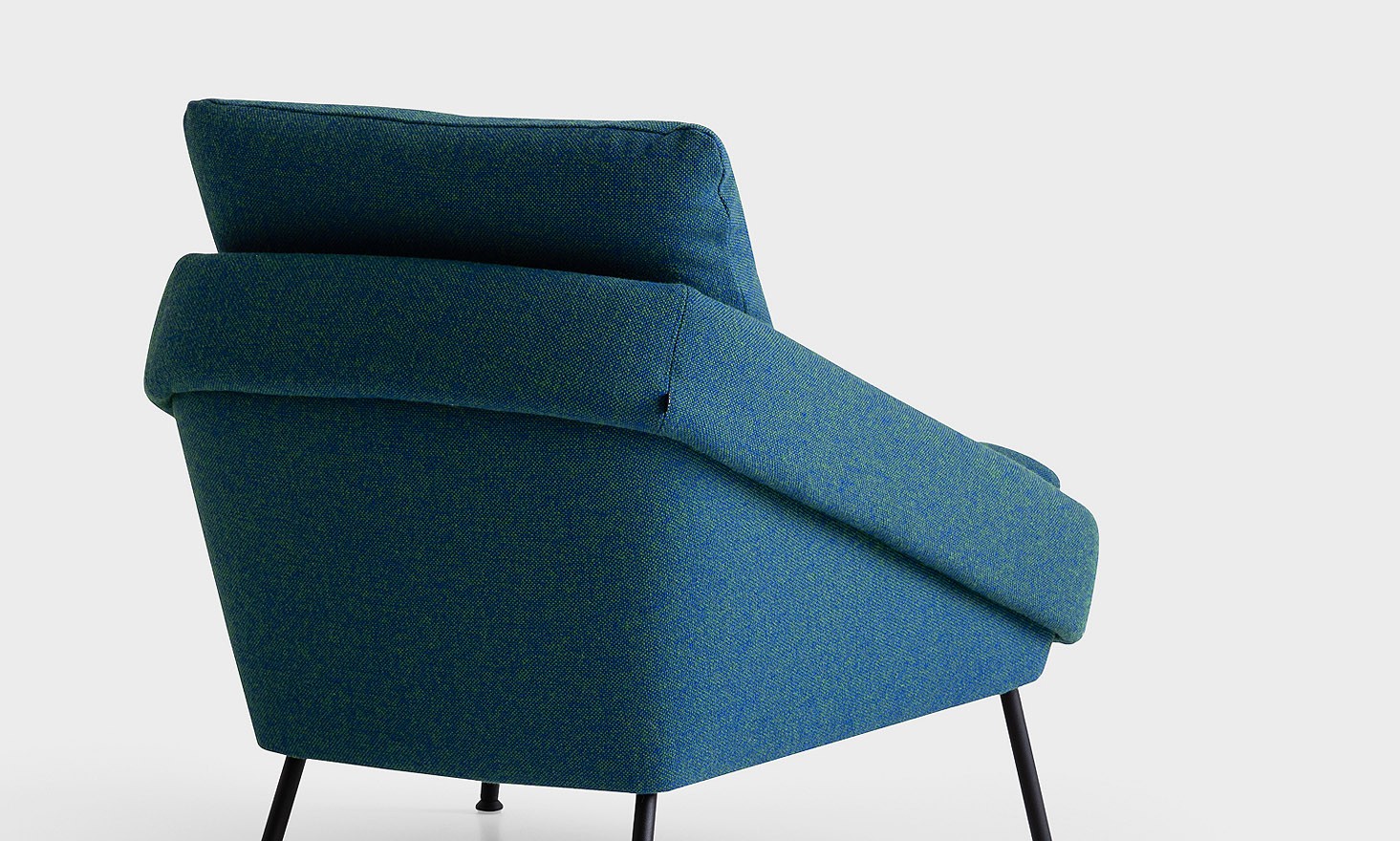 Charakterystyczny kształt luźnej poduszki oparciowej z widocznym poziomym podziałem podkreśla ergonomię siedziska oraz komfort oparcia, jednocześnie nadając mu wizualnej wyrazistości.